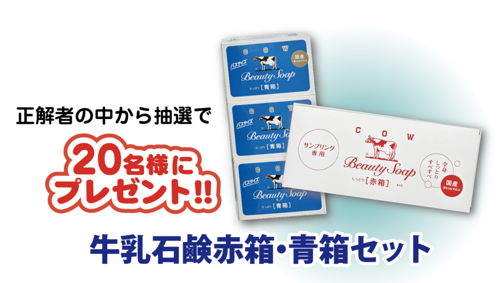 こちらは読売新聞ご愛読者さま専用ページです。 今月25日号のプレゼントは 牛乳石鹸赤箱・青箱セット 正解者の中から抽選で20名様にプレゼント※応募締切は3月1日(日)まで ※事業所でお申し込みの方は事業所名を、個人でお申し込みの方はお名前をご入力ください。 クイズの第1問の答え(必須) クイズの第2問の答え(必須) 希望のプレゼント(必須) 牛乳石鹸赤箱・青箱セット お名前(必須) ふりがな(必須) 郵便番号(必須) 住所(必須) 電話番号(必須) メールアドレス(必須) 領収書お問い合せNo ご意見や感想などありましたら、ご入力ください。